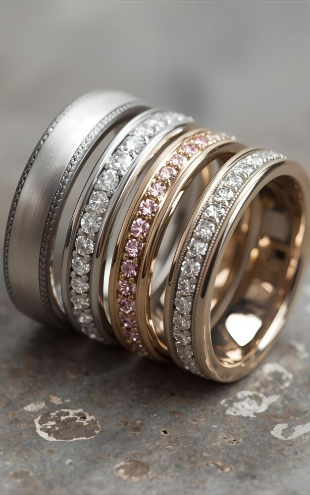 Nothing says “eternal love” like a full circle of diamonds. Eternity bands (with gems all around) and pavé styles (tiny diamonds set closely for a paved effect) are hot for adding major bling without overwhelming your engagement ring. Create a unique wedding band stack with multiples for a graduated sparkle effect—opt for low-profile versions for everyday wear. This trend is timeless yet trendy for sparkle-loving brides.